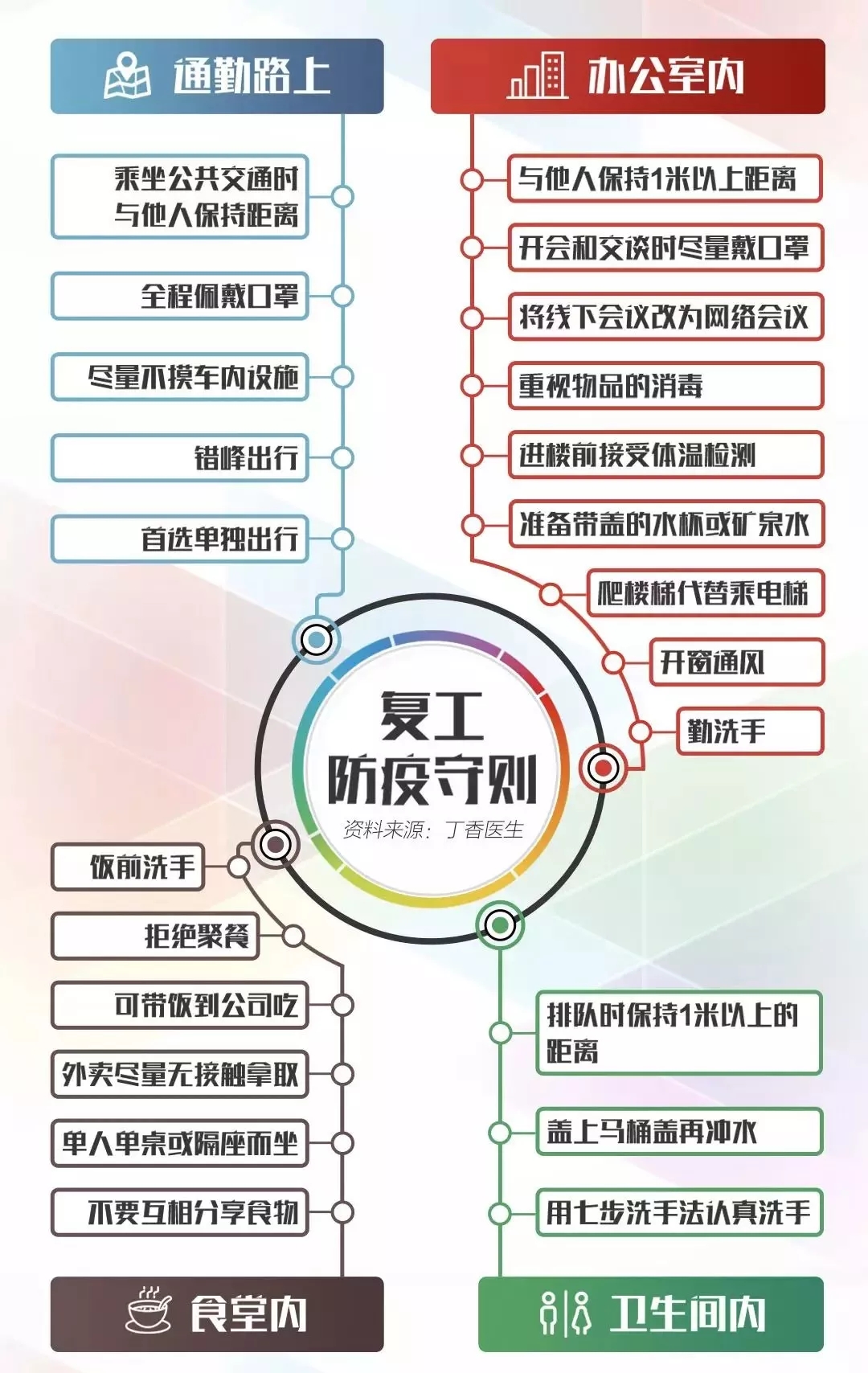 本周,不少人已開啟節(jié)后復工模式 通勤路上如何防護? 辦公室里要注意哪些細節(jié)? 在食堂用餐應規(guī)避哪些風險? 收好下面這份復工防疫守則 關鍵信息一目了然↓↓↓