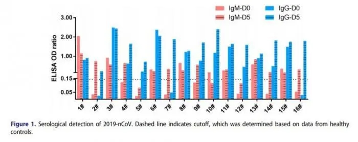 ▲16位患者采樣當(dāng)天和第五天體內(nèi)IgM和IgG滴度對比數(shù)據(jù)