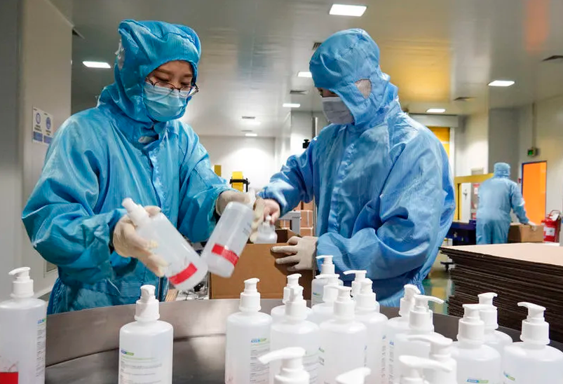 1月31日,山東能源新華醫(yī)療手消毒液包裝車間員工正在包裝酒精含量75%以上的免洗手消毒液,隨后將以最快速度發(fā)往武漢。(袁宏 攝)