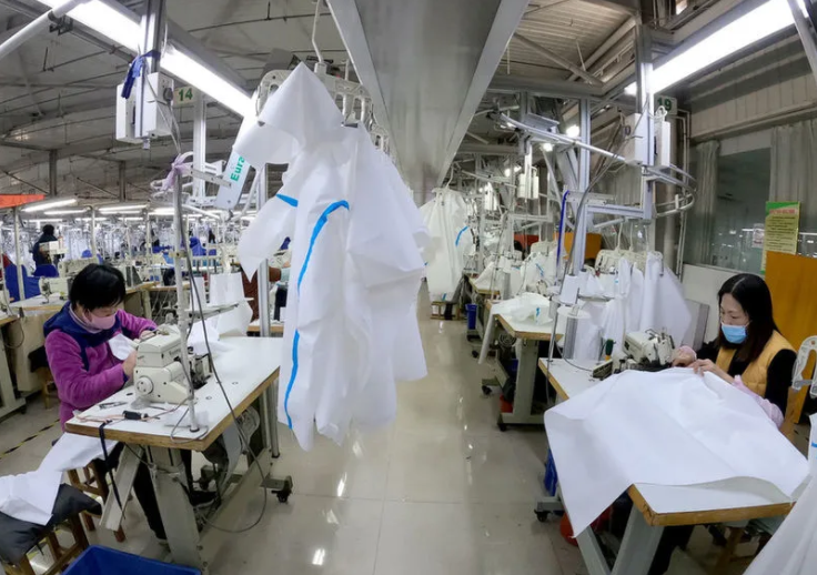1月30日,棗莊市山東康力醫(yī)療器械科技有限公司的生產(chǎn)車間工人,在嚴格消毒環(huán)境下生產(chǎn)醫(yī)用防護服。(孫中喆 攝)