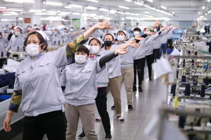 2月21日,山東青島市即墨區(qū)即發(fā)集團的女工在縫紉機臺旁做工間操。(梁孝鵬 攝)