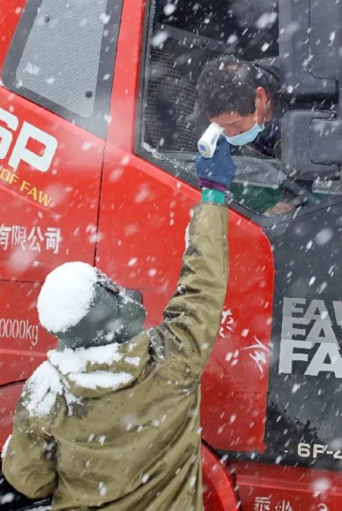2月15日,在榮烏高速公路山東煙臺收費站,防疫人員冒雪對入城車輛的司乘人員進行體溫測量。(唐克 攝)