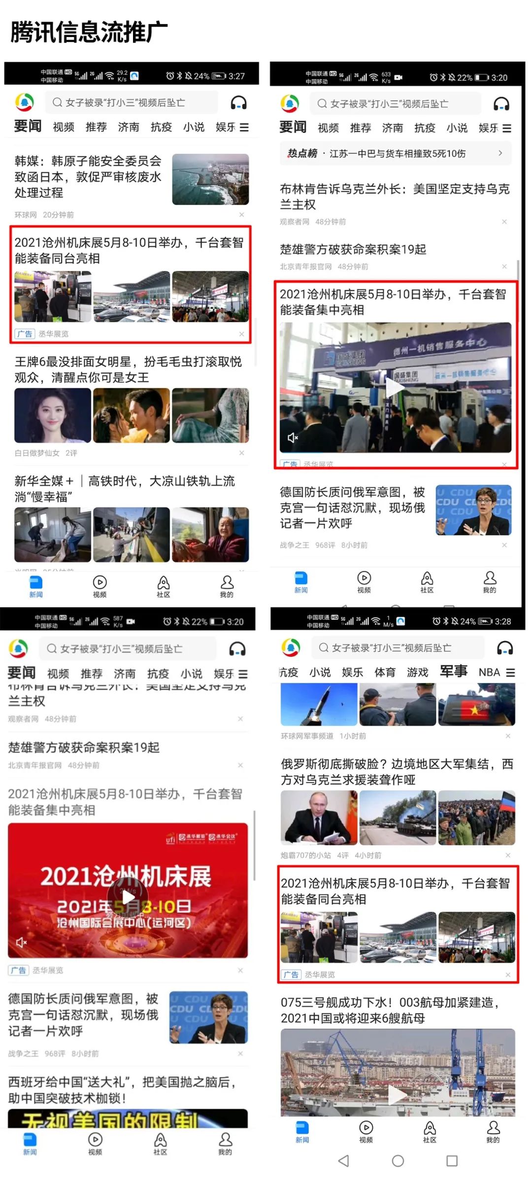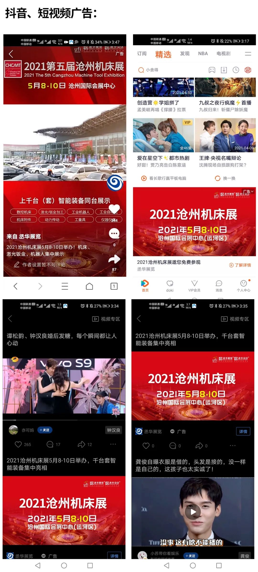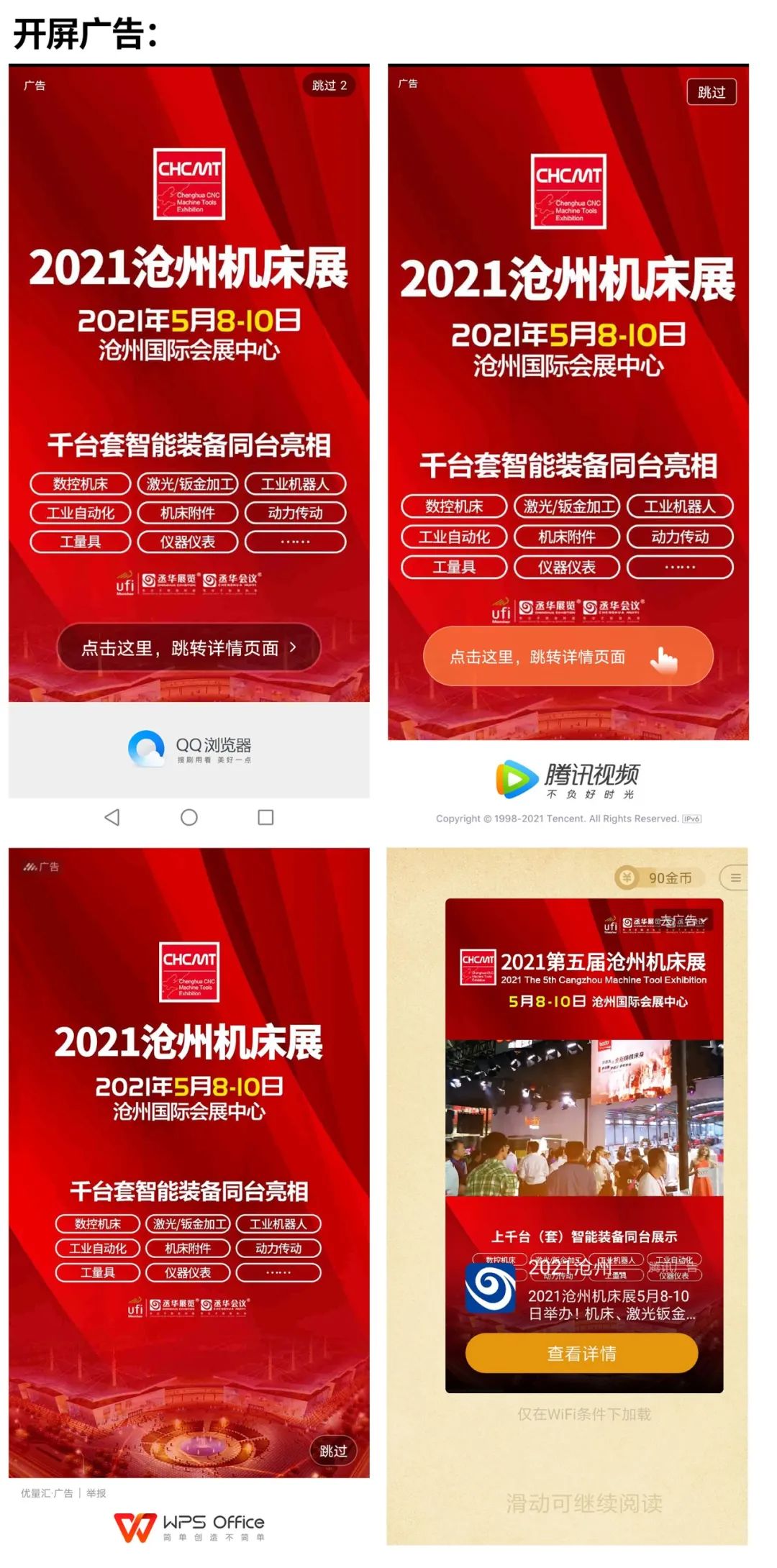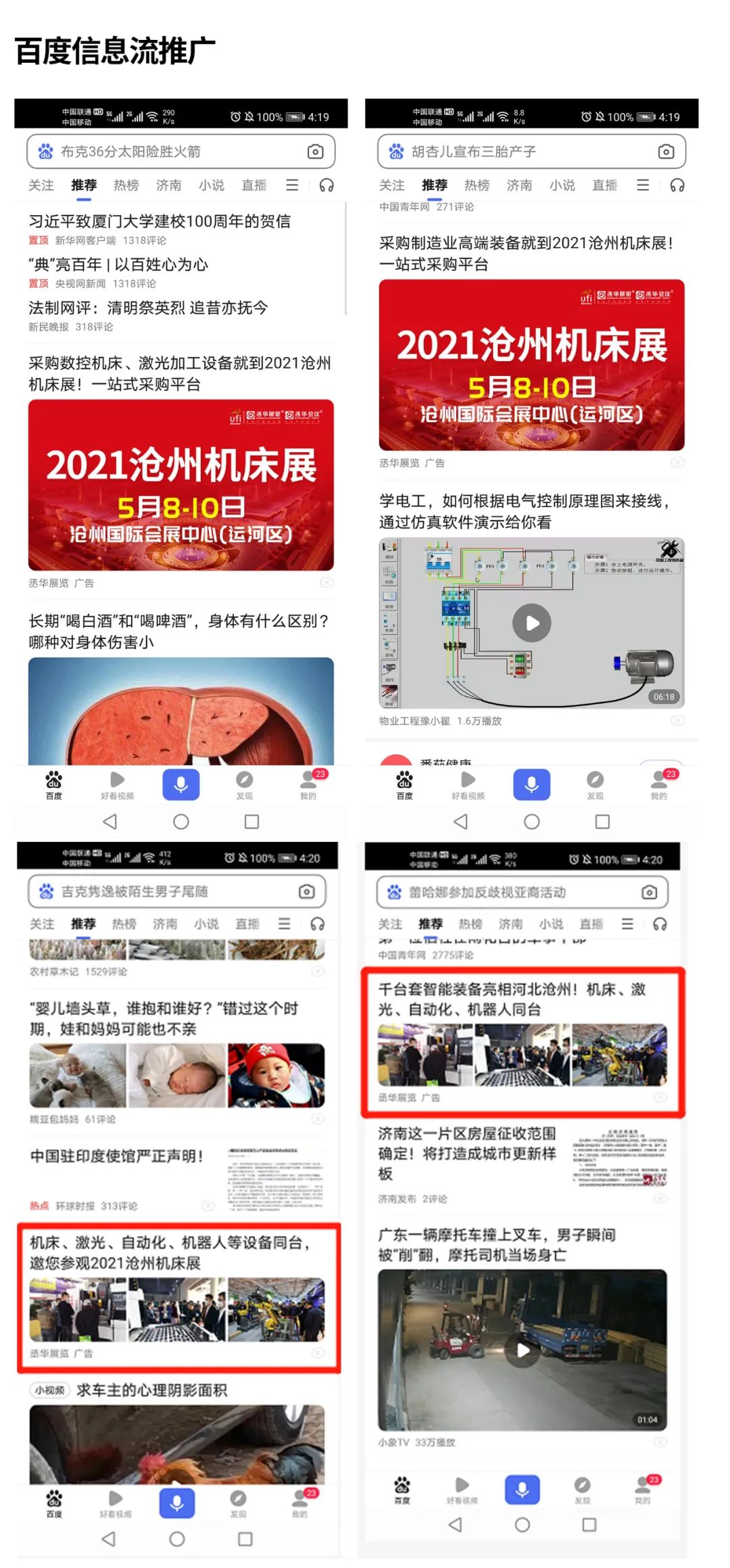 本屆展會(huì)加大線上及線下廣告投入,線上宣傳根據(jù)用戶興趣精準(zhǔn)投放,在百度、微信、騰訊、頭條、抖音、360及上百余個(gè)app中大量展示展會(huì)廣告,像“采購(gòu)機(jī)床、激光、鈑金設(shè)備、工業(yè)自動(dòng)化、機(jī)器人等產(chǎn)品就到2021滄州機(jī)床展”這樣的宣傳短語(yǔ)遍布,每天針對(duì)制造業(yè)用戶曝光量超40萬(wàn)次,每天接到參觀咨詢的電話絡(luò)繹不絕。