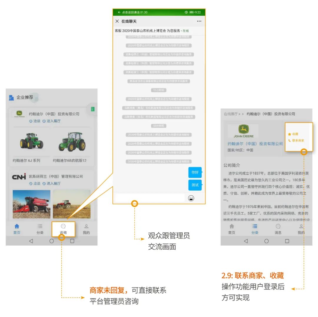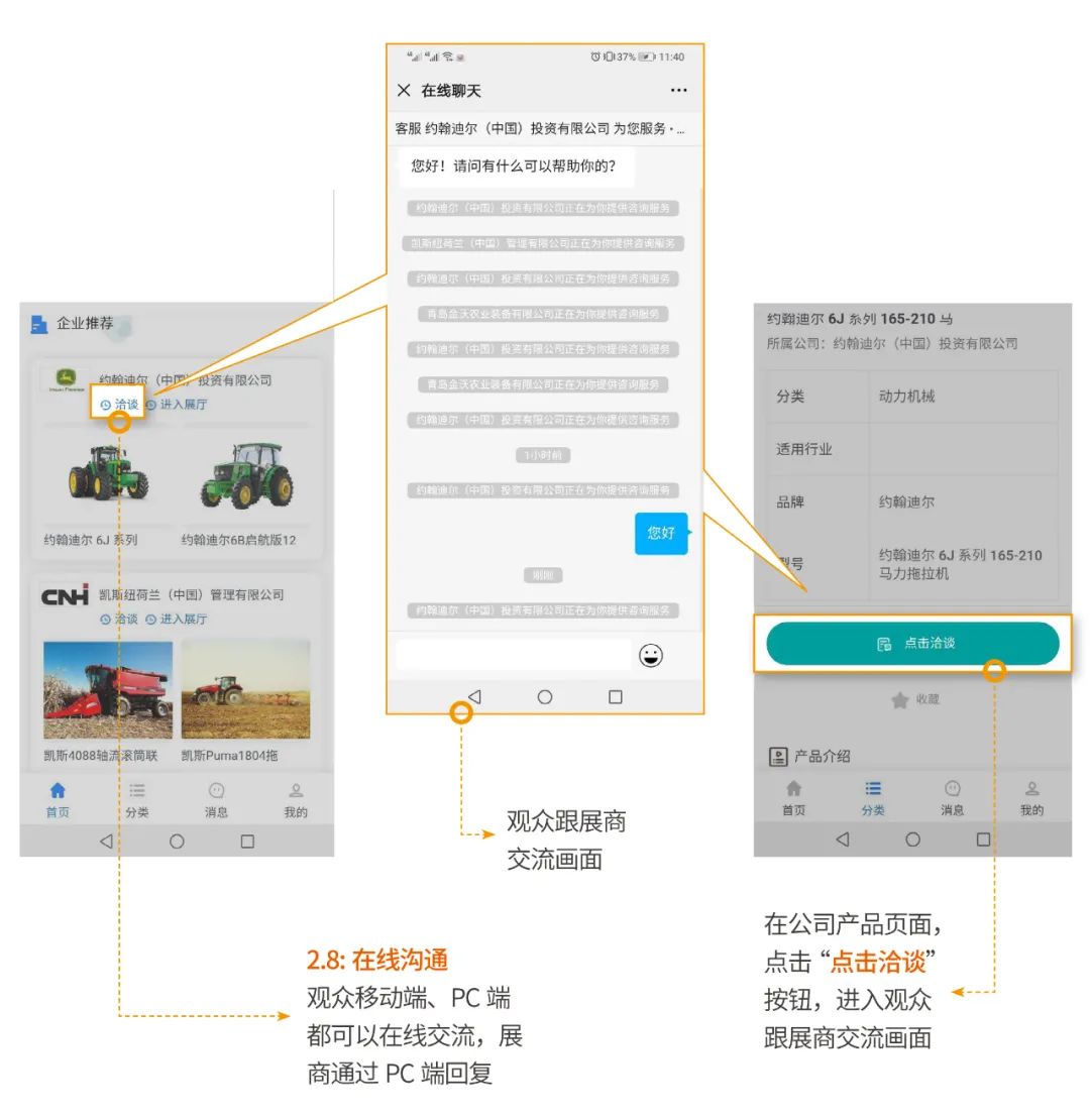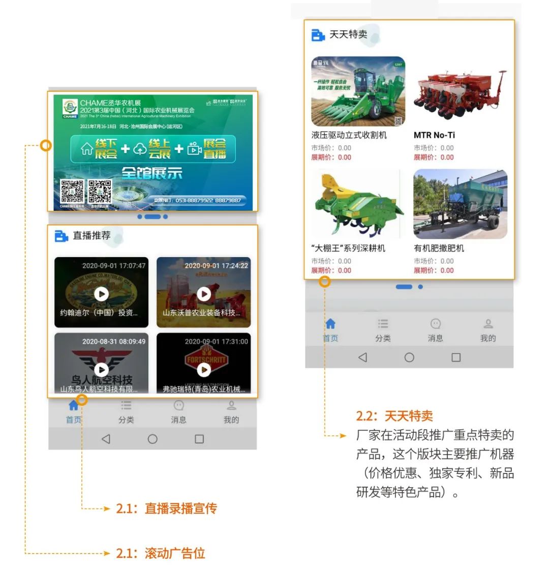首個(gè)“農(nóng)機(jī)線上博覽會(huì)”平臺(tái)并且投入使用,設(shè)置直播推薦、品牌企業(yè)、特賣(mài)商城、地區(qū)專(zhuān)場(chǎng)4大版塊,開(kāi)發(fā)了機(jī)具展示、直播互動(dòng)、貿(mào)易洽談、線上交易4項(xiàng)功能,實(shí)現(xiàn)電腦、手機(jī)客戶(hù)端兩端融合,企業(yè)免費(fèi)入駐,觀眾掃碼即進(jìn),讓參展商和觀眾隨時(shí)溝通洽談。