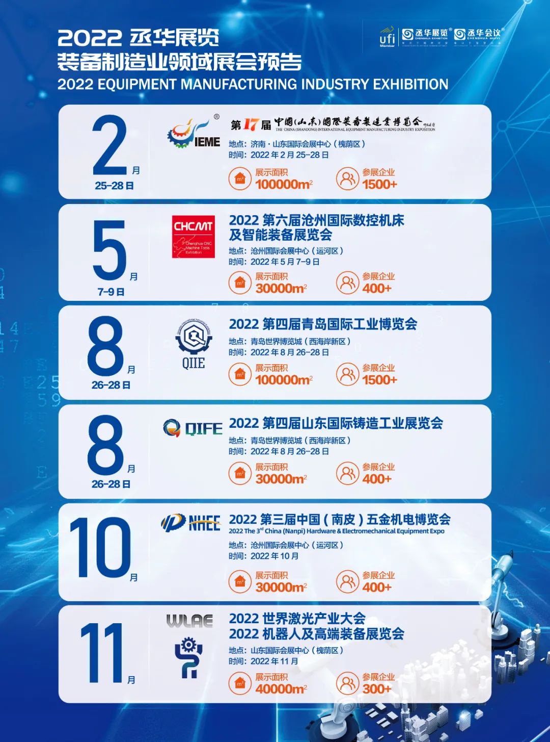 2022第17屆中國(山東)國際裝備制造業(yè)博覽會定于2022年2月25-28日在山東國際會展中心(槐蔭區(qū))舉辦。開設(shè)8大展館(滿館),面積超過10萬平方米,重點展示數(shù)控機床、激光切割、工業(yè)自動化、工業(yè)機器人、智能裝備、功能部件等最新技術(shù)及產(chǎn)品,匯聚1500家參展企業(yè)同臺,主流品牌悉數(shù)亮相。