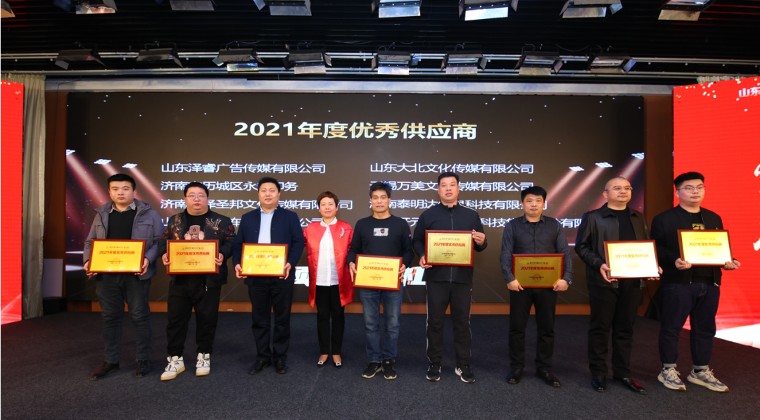 經(jīng)過公司各項目部門和職能部門的共同推薦,山東澤睿廣告?zhèn)髅接邢薰尽⑸綎|大北文化傳媒有限公司、濟南市歷城區(qū)永超印務、無錫萬美文化傳媒有限公司、濟南天澤圣邦文化傳媒有限公司、濟南泰明達信息科技有限公司、山東鑫派汽車服務有限公司、世紀開元智印互聯(lián)科技集團股份有限公司8家合作單位獲得2021年度優(yōu)秀合作供應商獎項。