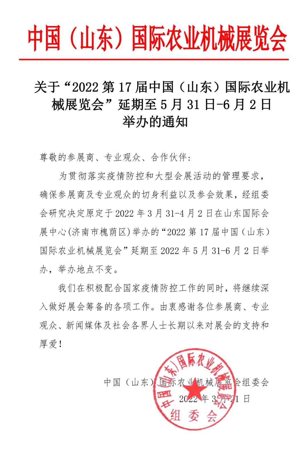 為貫徹落實(shí)國(guó)家及地方政府對(duì)疫情防控和大型會(huì)展活動(dòng)的管理要求,切實(shí)保障展覽會(huì)所有參與者的身體健康和生命安全。經(jīng)組委會(huì)研究決定,原定于2022年3月31日-4月2日在山東國(guó)際會(huì)展中心舉辦的“2022第17屆中國(guó)(山東)國(guó)際農(nóng)業(yè)機(jī)械展覽會(huì)”延期至5月31日-6月2日舉辦,地點(diǎn)不變。因展會(huì)延期舉辦給大家?guī)?lái)的不便,我們深表歉意,敬請(qǐng)諒解!