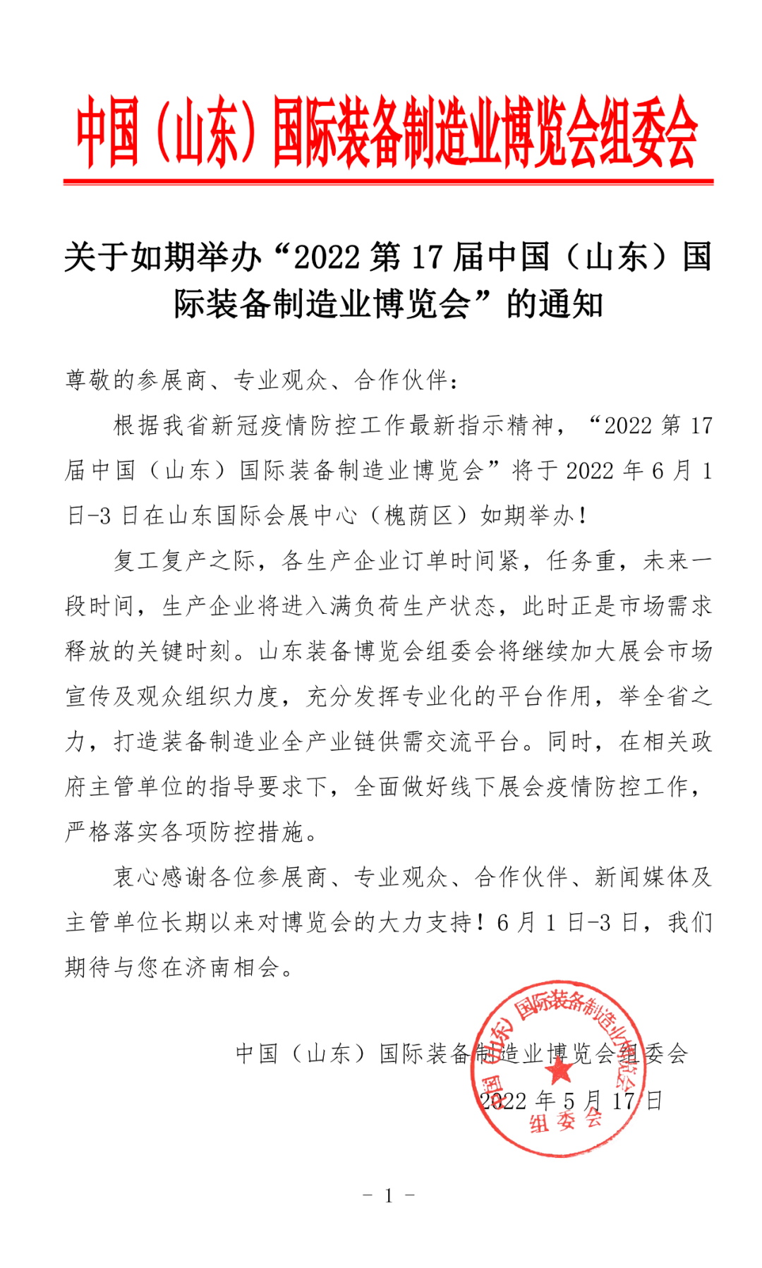 根據我省新冠疫情防控工作最新指示精神,“2022第17屆中國(山東)國際裝備制造業(yè)博覽會”將于2022年6月1日-3日在山東國際會展中心(槐蔭區(qū))如期舉辦!