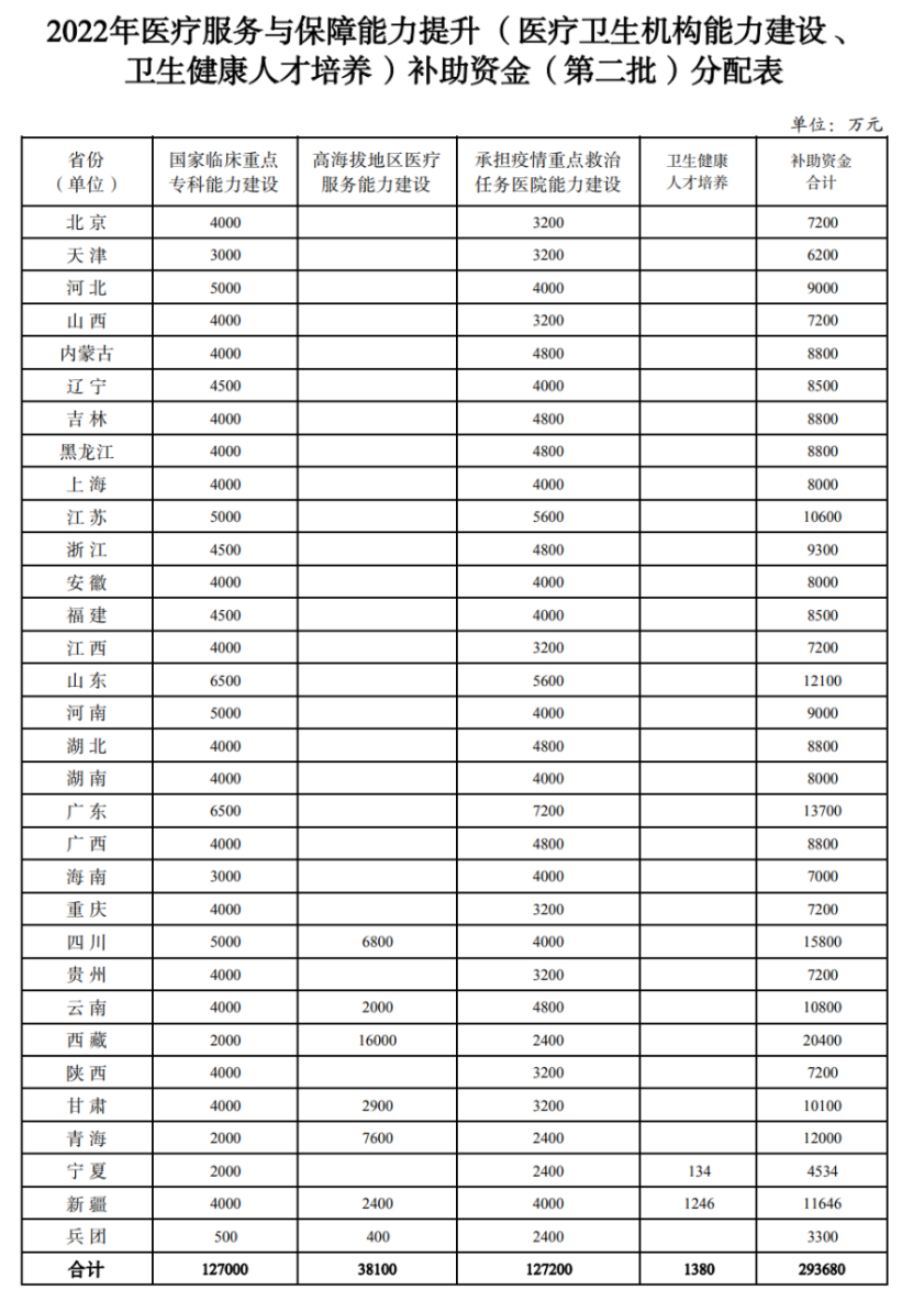 根據(jù)文件數(shù)據(jù),下達2022年醫(yī)療服務(wù)與保障能力提升(醫(yī)療衛(wèi)生機構(gòu)能力建設(shè)、衛(wèi)生健康人才培養(yǎng))補助資金(第二批)用于支持國家臨床重點??平ㄔO(shè)、高海拔地區(qū)醫(yī)療服務(wù)能力建設(shè)、承擔疫情重點救治任務(wù)醫(yī)院能力建設(shè)以及衛(wèi)生健康人才培養(yǎng)補助,合計29.3億余元。