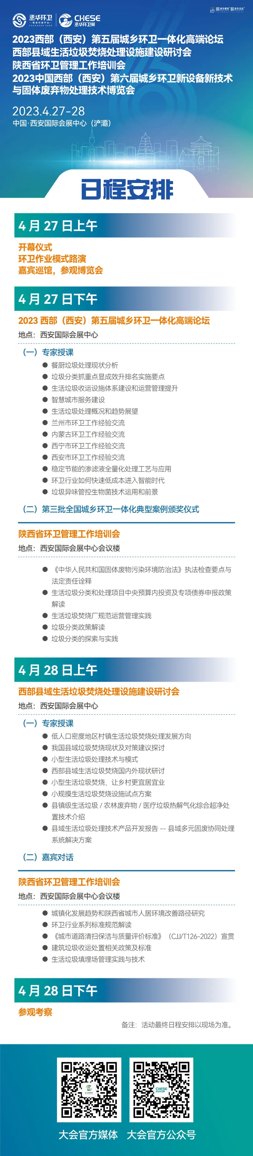 2023西部(西安)第五屆城鄉(xiāng)環(huán)衛(wèi)一體化高端論壇、西部縣域生活垃圾焚燒處理設(shè)施建設(shè)研討會及陜西省環(huán)衛(wèi)管理工作培訓(xùn)會各有側(cè)重,邀請政府部門領(lǐng)導(dǎo)、知名專家學(xué)者、品牌企業(yè)大咖等共同參與,以專家授課、嘉賓對話、城市交流等多種形式,助推西部地區(qū)環(huán)衛(wèi)行業(yè)新發(fā)展!應(yīng)廣大參會代表和觀眾要求,現(xiàn)就整體活動初步日程安排進行公布,歡迎了解!