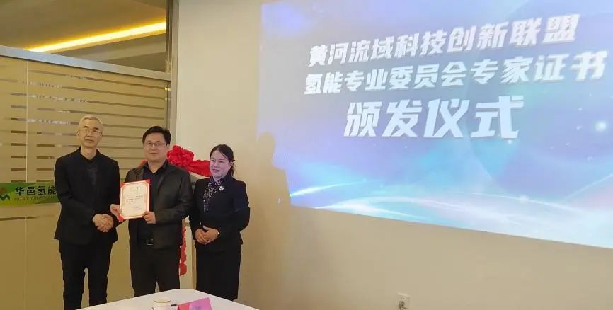 黃河流域科技創(chuàng)新聯(lián)盟氫專委副秘書長(zhǎng)張文良、侯志紅為周飛鯤博士頒發(fā)了黃河流域科技創(chuàng)新聯(lián)盟氫能專委會(huì)專家證書。