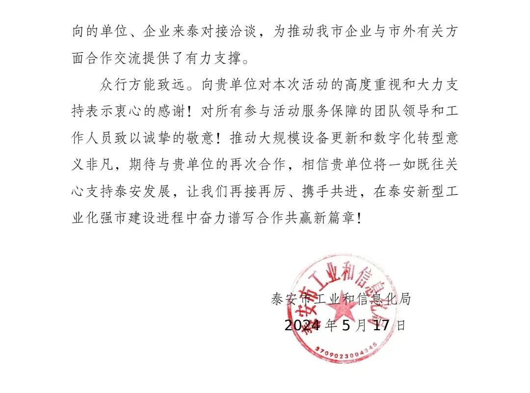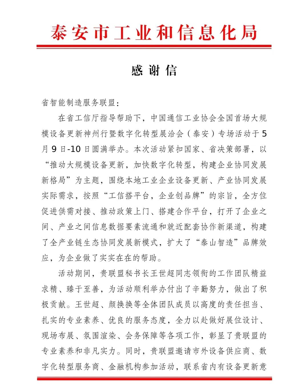 5月17日,泰安市工信局向省智能制造服務(wù)聯(lián)盟發(fā)來(lái)感謝信。信中對(duì)5月9-10日在泰安新泰舉辦的“全國(guó)首場(chǎng)大規(guī)模設(shè)備更新神州行暨數(shù)字化轉(zhuǎn)型展洽會(huì)(泰安)專場(chǎng)活動(dòng)”期間,聯(lián)盟秘書長(zhǎng)王世超領(lǐng)銜的團(tuán)隊(duì)所表現(xiàn)出的對(duì)工作精益求精,以及過(guò)硬的專業(yè)素養(yǎng)和能力、細(xì)致高效的服務(wù)水平等給予了高度肯定,并表示衷心感謝。